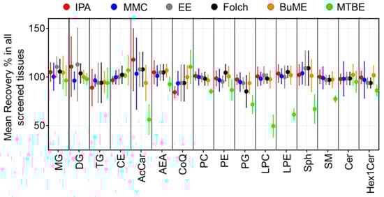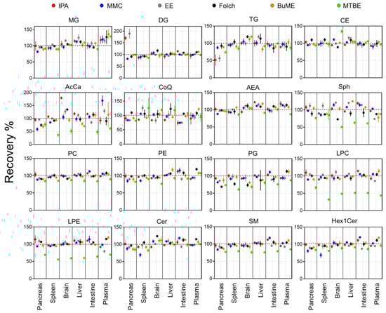 Recoveries for each method were assessed by comparing the ratio of peak areas of SIL internal standards spiked before and after the extraction of lipids from the six tested mouse tissues (Figure 1). Results showed that the IPA method had an average recovery of 84.4–117.9%. The lowest recovery using IPA was observed when extracting TG from the pancreas (51.7%). Moreover, IPA exerted relatively low recoveries of CoQ from the brain (83.6%), intestine (73.3%), and liver (84.2%). In the case of the MMC method, average recoveries were 93.6–104.0%. The lowest recovery using MMC was observed when extracting AcCa from the pancreas (58.2%). In general, MMC had better recoveries when extracting brain, liver, and plasma, with recoveries ≥92.9%. However, MMC had lower recoveries when extracting pancreas (≥58.2%), spleen (≥68.8%), and intestine (≥74.3%). For the EE method, on average, the recoveries were 93.8–113.0%. Like IPA, the recovery of TG from the pancreas was the lowest (56.5%). In addition, like MMC, the recovery of CoQ from the pancreas and intestine was low (83.3 and 74.9%, respectively). Plasma had the lowest recovery of LPE (79.4%) and Sph (74.0%). As for the Folch method, average recoveries were 85.2–109.7%. The lowest recoveries were observed for PG extracted from the pancreas (68.7%), spleen (76.7%), and brain (73.5%). BUME had average recoveries of 93.8–106.8%. Low recoveries were observed when extracting AcCar from the pancreas (68.8%) and liver (79.3%) in addition to Sph from plasma (77.8%) and TG from the liver (82.4%). Finally, the MTBE method had the lowest average recoveries among all tested methods (49.6–110.5%). Interestingly, MTBE had very low recoveries when extracting PG (71.8% ± 9.3), LPC (49.6% ± 11.3), LPE (61.5 ± 5.7), and AcCar (56.3% ± 15.2). The average recoveries of each lipid class using the tested methods were compared across all mouse tissues (Figure 2). Results showed that, in general, all tested methods had comparable results when extracting non-polar lipids (MG, DG, TG, and CE). However, the recovery of polar lipids (LPC, LPE, Sph, SM, and AcCar) was dramatically reduced when using the MTBE method. Moreover, other polar lipids (PC, PE, PG, and Hex1Cer) had slightly lower recoveries using MTBE.