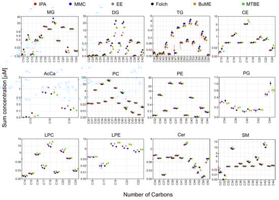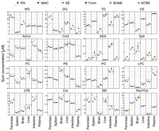For that purpose, pooled samples of lipid extracts of the same tissue type collected using the six tested extraction methods were subjected to LC-MS/MS analysis in positive and negative modes. The identification of endogenous lipid species was carried out using LipidSearch software. For the accurate quantification of endogenous lipids, a single-point calibration was created against the spiked SIL standards prior to extraction as per the guidelines of the Lipidomics Standards Initiative []. The sum of absolute concentrations of lipid species of the same class is exhibited in Figure 3. Results showed that except for DG and TG, the sum concentrations of most of the identified lipids were comparable across different extraction methods. This suggested that the addition of SIL internal standards prior to lipid extraction could compensate for the insufficient recovery of polar lipid classes (LPC, LPE, Sph, SM, and AcCar) but not for non-polar lipid classes such as DG and TG. This is consistent with the reported literature []. For DG and TG, the highest concentrations in most cases were found using the Folch method. Liver samples had the highest triacylglycerides (TG) abundances when compared with other organs. This is consistent with results reported in the literature []. Large variations of DG in the pancreas among different extraction methods may reflect the pancreatic lipase activities or lack of in those solvents.