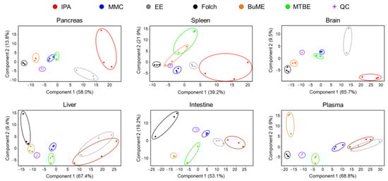 The overall differences in the lipidome obtained using different extraction protocols were examined using unsupervised principal components analysis (PCA). As shown in Figure 5, the quality control (QC) samples, periodically injected throughout the analysis, were almost superimposed in the PCA plot, demonstrating that all detected lipid species in the QC samples were consistent with no shifts during the entire analysis period, the LC-MS system was stable, and the analysis was repeatable. PCA also showed a clear clustering of samples with the same extraction method and segregation of samples between different extraction methods, indicating that each lipid extraction method generated different lipidomic profiles (Figure 5). In all evaluated tissues, the IPA method had the least clustering, suggesting poor reproducibility. Moreover, EE showed poor reproducibility in extracting lipidomes of the pancreas, brain, liver, and plasma. Folch showed high reproducibility in extracting lipidomes of the pancreas, spleen, brain, and plasma. However, Folch gave poor reproducibility when extracting lipidomes of liver and intestine tissues. MMC, on the other hand, gave high reproducibility except for plasma, for which Folch gave the highest clustering and reproducibility. For the liver and intestine lipidomes, MMC and BUME methods showed the highest reproducibility (Figure 5).
