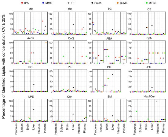 To check the repeatability of extracting endogenous lipids in greater detail, CV% of the sum concentrations of each lipid class from the three technical replicates prepared for each tissue are shown in Figures S1–S4. Figure 6 presents the percentage of identified lipids with concentrations having CV ≥ 25%. Results showed that the Folch method suffered from poor reproducibility when extracting liver samples with median CV% values dramatically higher than the other extraction methods in almost all identified lipid classes. Apart from that, in general, polar lipid classes (PC, PE, PG, LPC, LPE, SM, Cer, and Hex1Cer) had high reproducibility with a median CV < 15% (Figures S2 and S3). Moreover, the number of polar lipid species with CV ≥ 25% was very low (in most cases <15% of the total number of identified lipids within the same class, Figure 6). The exception to that was the endogenous PG, which, when extracted from the brain using MMC, Folch, BUME, or MTBE methods, had a median CV of 16.6, 24.4, 27.3, or 29.1%, respectively (Figure S2) and >30% of identified lipids had CV ≥ 25% (Figure 6). In addition, when extracting PG lipid species from the spleen using MTBE, sum concentrations had a median CV of 18.4% (Figure S2), and 27.3% of identified PG had CV ≥ 25% (Figure 6). Another exception was Hex1Cer, which had a median CV of 16.9% when extracted using MTBE from the pancreas and 34.2 and 22.6% when extracted from the intestine using EE or MTBE methods, respectively (Figure S3). In addition, EE had bad reproducibility when extracting Hex1Cer from the intestine, as all identified Hex1Cer had CV ≥ 25% (Figure 6). Moreover, CE had a high reproducibility with a median CV < 15% in all tissues and all extraction methods, except when employing Folch for extracting liver samples (Figure S4). A relatively high fraction (33.3%) of CE extracted from the brain using either Folch or BUME had CV ≥ 25% (Figure 6). On the other hand, the reproducibility in extracting glycerolipids was lower than polar lipids. The IPA method had poor reproducibility when extracting MG from plasma and TG from the pancreas with a median CV of 38.9 and 29.4%, respectively (Figure S1), and more than half of those identified lipids had CV ≥ 25% (Figure 6). BUME had the highest reproducibility in extracting MG, DG, and TG from all six tissues with median CV values < 15% (Figure S1). For Sph, AcCa, and CoQ, MMC had the best reproducibility with median CV values < 15% in all tissues (Figure S4), and less than 17% of identified lipids had CV < 25% (Figure 6). For AEA, BUME had the best reproducibility with median CV values ≤ 15% in all mouse tissues (Figure S4). It is worth mentioning that 21.4% of identified Cer from plasma and 50% of identified Hex1Cer from the pancreas, using the MTBE method, had CV ≥ 25%. Moreover, 21.4% of identified LPE from the brain using the BUME method had CV ≥ 25% (Figure 6).