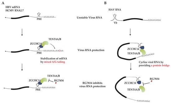 HAV is a single-stranded (ss) RNA virus with a small positive-sense RNA as a genome. Viral genome RNA 3′ end is polyadenylated, but instead of 5′ capping, the 5′ end is covalently linked to a small viral protein VPg, the putative protein primer for minus-strand RNA synthesis. Although HAV replication cycle still remains unclear, its genome replication is expected to use RNA as template to directly synthesize complementary RNA [56]. HAV infection was also reported to require ZCCHC14 and TENT4A/4B [33,57]. However, unlike the case of HBV/HCMV, TENT4A/4B and ZCCHC14 mainly affect HAV RNA synthesis. Viral RNA poly(A) tail length, stability, and translation are unaffected but nascent viral RNA synthesis is significantly diminished by treatment of TENT4 inhibitor RG7834 [32]. ZCCHC14 could recognize a stem-loop with a CUGGN-type pentaloop in the 5′ UTR of viral genome RNA and recruit TENT4. A proposed model according to these data is that ZCCHC14-TENT4 forms a protein bridge between the 5′ UTR and 3′ end of viral genome RNA so circularizes HAV RNA and enhances viral RNA replication (Figure 2B) [32]. It remains to be determined whether HAV RNA replication is dependent on the terminal nucleotidyltransferase activity of TENT4.