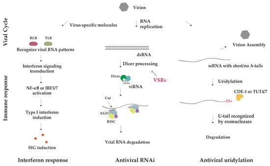 Eukaryotic cells have evolved the RNA-based antiviral immunity to escape from viral infection. One well-known mechanism is that long double-stranded RNAs (dsRNAs) derived from the virus in infected cells induce RNA interference (RNAi) to specifically remove viral RNAs [34,35]. Dicer, a member of the RNase III family, cleaves these dsRNAs into virus-derived small interfering RNAs (viRNAs), which are loaded into Argonaute (AGO) proteins to form the RNA-induced silencing complex (RISC) and thereby silencing viral RNAs [36,37,38,39]. Recent studies have identified a novel mechanism of virus–host interaction, which is conserved across animals and mediated through 3′ tailing of viral RNAs [40,41,42]. Interestingly, two types of 3′ tails, U-rich tail and mixed tail, lead to distinct consequences. The U-rich tail deposited by TUTases at the viral RNA terminus triggers viral RNA decay [40,43,44]. On the contrary, some viruses employ mixed tails to protect their RNAs from decay [45]. Increasing evidence has suggested that the length and composition of the viral RNA tail are a hotspot for evolutionary battle between viruses and their hosts.
