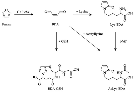 Furan has been classified by the International Agency for Research on Cancer (IARC) as possibly carcinogenic to humans (group 2B) [11]. Furan and 2-MF have been shown to exert dose-dependent liver toxicity and carcinogenic effects in rodent studies [2,12]. However, it is not yet clear whether furan or 2-MF exerts a genotoxic effect, as the results of in vivo and in vitro genotoxicity tests are inconclusive [2,13]. After oral intake, furan and 2-MF are absorbed from the gastrointestinal tract. It has been reported that when radiolabeled [2,5-14C]-furan (8 mg/kg bodyweight (bw)) was administered to rats via gavage, approximately 80% of the radioactivity was eliminated within 24 h, of which 14% was exhaled as furan and 26% as CO2, and 20% was detected in urine and 22% in feces [14]. After absorption, furan is metabolized by cytochrome P450 2E1 to cis-2-buten-1,4-dial (BDA) [15].