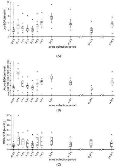 Excretion kinetics (nmol/h) of (A) Lys-BDA, (B) AcLys-BDA and (C) GSH-BDA from 12 h before to 36 h after ingestion of 500 mL of coffee brew. (n = 10) Boxes, Perc 25/75, whisker, 95% confidence interval; squares, mean; dash, median; times symbol, minimum and maximum; dashed gray line, coffee intake.