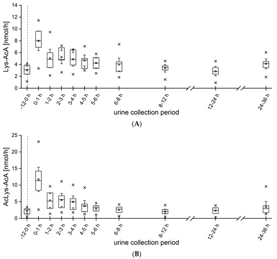 Excretion kinetics (nmol/h) of (A) Lys-AcA and (B) AcLys-AcA from 12 h before to 36 h after ingestion of 500 mL of coffee brew. (n = 10) Boxes, Perc 25/75, whisker, 95% confidence interval; squares, mean; dash, median; times symbol, minimum and maximum; dashed gray line, coffee intake.