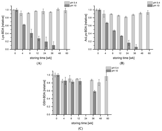 Stability of (A) Lys-BDA, (B) AcLys-BDA and (C) GSH-BDA stored at pH 5.4 and 10 over a period of 60 weeks at −20 °C. Data for GSH-BDA after 24 weeks are missing.