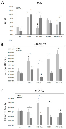 APA StyleLopez, J., Al-Nakkash, L., Broderick, T. L., Castro, M., Tobin, B., & Plochocki, J. H. (2023). Genistein Suppresses IL-6 and MMP-13 to Attenuate Osteoarthritis in Obese Diabetic Mice. Metabolites, 13(9), 1014. https://doi.org/10.3390/metabo13091014