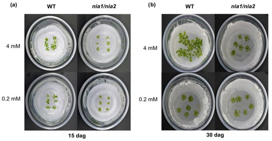 Growth contrasts between the WT genotype and the double mutant nia1/nia2. The top view of hydroponic chambers shows the growth of the WT genotype and loss-of-function double mutants nia1/nia2 at (a) 15 dag and (b) 30 dag, with larger WT rosettes at both nitrate concentrations (4 and 0.2 mM). The arrested growth of nia1/nia2 double mutants can be observed even at the optimal nitrate concentration (4 mM). According to the notion of proportion, the diameter of the hydroponic chambers is 12 cm.