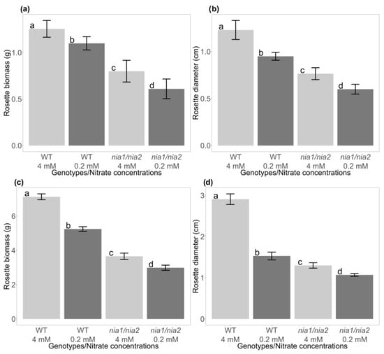 The rosette (aerial part) growth of WT and double mutant nia1/nia2 A. thaliana genotypes. (a) Fresh net biomass and (b) rosette diameter after 15 days of growth of seedlings in a medium supplemented with optimal and limited concentrations of N (4 and 0.2 mM, respectively) ((c,d) represent the same metrics but at 30 dag). Bars represent the average values of 18 replicates ± standard deviation. The small letters in each bar represent the one-way ANOVA results and Tukey’s post hoc test clustering.