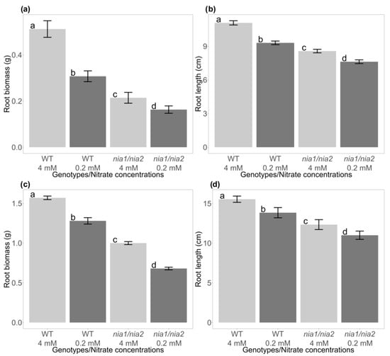 Root growth of WT and double mutant nia1/nia2 A. thaliana genotypes. (a) Fresh net biomass and (b) root length after 15 days of growth of seedlings in a medium supplemented with optimal and limited concentrations of N (4 and 0.2 mM, respectively) ((c,d) represent the same metrics but at 30 dag). Bars are average values of 18 replicates ± standard deviation. The small letters in each bar represent the one-way ANOVA results and Tukey’s post hoc test clustering.