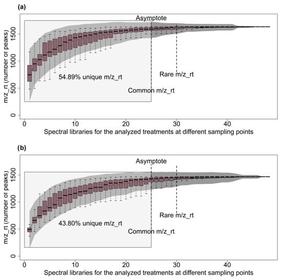 m/z_rt accumulation curves of the A. thaliana metabolome. (a,b) Positive and negative ESI modes (ESI+ and ESI−, respectively). The limit of common m/z_rt is defined as the point at which the shoulder of the curve (width) reaches the asymptote. Even when the curves are similar, the A. thaliana metabolome obtained in ESI+ mode is much more diverse than that obtained in ESI− mode. The box plots show the median and SD for the smallest sample size. The light gray box represents the area where the unique mz/rt are found, contributing most of the diversity of the A. thaliana metabolome for both ESI modes.