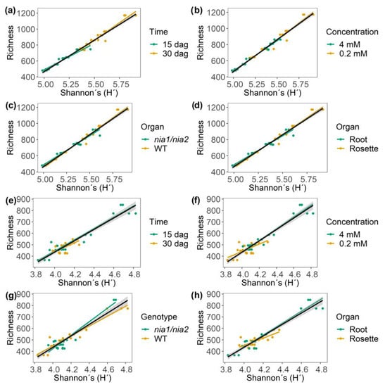 Pearson’s correlation (r) and covariance (R2) analyses were performed in order to verify the patterns described above (H’, richness, and J’) using a rearrangement based on the variable under study (time, concentration, genotype, or organ) to identify the behavior and distribution of the m/z_rt based on the variable of interest. Therefore, we were able to elucidate that in ESI+ mode, richness is positively correlated with a relatively high percentage of covariance, depending on the diversity (H’), with r = 0.98 and R2 = 96.6%, and a p value ≤ 0.05 (Figure 6a–d). For the time variable, the maximum diversity in terms of richness was achieved at 30 dag (Figure 6a). For the nitrate concentration variable, at a concentration of 0.2 mM, the richness and diversity are influenced by other variables (Figure 6b). With respect to the genotype variable (WT and nia1/nia2), both genotypes benefited from the conditions established in the time-course experiment. However, the richness and diversity were the greatest in the WT genotype. Finally, in relation to the organ variable (shoot vs. root), shoots corresponded with the greatest observed m/z_rt diversity.
