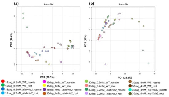 Data obtained from spectral libraries were normalized using no-scale values and the quantile transformation and log transformation methods because they generally improve data interpretability by reducing skewness [,]. For both ESI modes, the range of normalized intensities obtained from each detected m/z_rt showed a normal distribution (or Gaussian distribution; Figure S8). Once data were normalized, in order to identify trends or discriminant groups responsible for the highest percentage of variance, unsupervised multivariate analyses were implemented, visualizing the multidimensional relationships of the measured variables, that is, each m/z_rt obtained under predefined conditions (N concentration (4 or 0.2 mM), sampling point (15 or 30 dag), genotype (WT or nia1/nia2), and organ (rosette or root)). Principal component analysis (PCA) did not show clearly distinguishable discriminating groups in either ESI+ or ESI− mode, which may explain the high percentage of variance (28.3 and 14.4% for principal component one (PC1) and 22.5 and 12% for PC2, respectively) (Figure 7 and Figure S9; Tables S8 and S9). The results were corroborated by the 2D PCA biplot analysis (eigenvalue and eigenvectors), with no clear distinction observed between the m/z_rt and the sample groups in either ESI+ or ESI− mode (Figure S10).