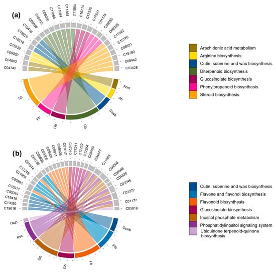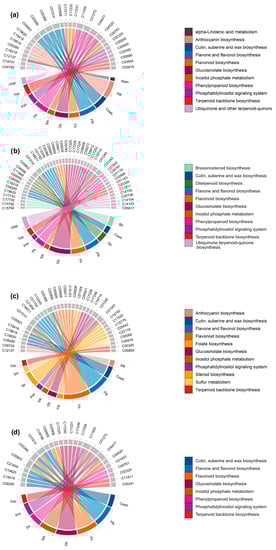 Enriched metabolic pathways in response to N availability in the A. thaliana WT genotype. (a) The metabolic pathways enriched at 4 mM in the rosettes include arachidonic acid metabolism (Acm); arginine biosynthesis (Ab); cutin, suberin, and wax biosynthesis (Cswb); diterpenoid biosynthesis (Db); glucosinolate biosynthesis (Gb); phenylpropanoid biosynthesis (Pb), and steroid biosynthesis (Sb). In contrast (b), the metabolic pathways enriched at 0.2 mM include cutin, suberin, and wax biosynthesis (Cswb); flavone and flavonol biosynthesis (Ffb); flavonoid biosynthesis (Fb); glucosinolate biosynthesis (Gb); inositol phosphate metabolism (Ipb); phosphatidylinositol signaling system (Pss); and ubiquinone and another terpenoid–quinone biosynthesis (Utqb). (c) In roots, the seven metabolic pathways most enriched when seedlings were grown at 4 mM include arginine and proline metabolism (Apm); brassinosteroid biosynthesis (Bb); cutin, suberin, and wax biosynthesis (Cswb); flavone and flavonol biosynthesis (Ffb); flavonoid biosynthesis (Fb); glucosinolate biosynthesis (Gb); phenylpropanoid biosynthesis (Pb); sphingolipid metabolism (Spm); sulfur metabolism (Sm); and ubiquinone and another terpenoid–quinone biosynthesis (Utqb). At 0.2 mM (d), the seven most enriched metabolic pathways include α-linolenic acid metabolism (Alam); cutin, suberin, and wax biosynthesis (Cswb); diterpenoid biosynthesis (Db); flavone and flavonol biosynthesis (Ffb); flavonoid biosynthesis (Fb); glucosinolate biosynthesis (Gb); phenylpropanoid biosynthesis (pb); and sulfur metabolism (Sm). Circos plots summarize the relationships between metabolites (annotated as m/z_rt and represented by KEGG codes) and metabolic pathways enriched by them.