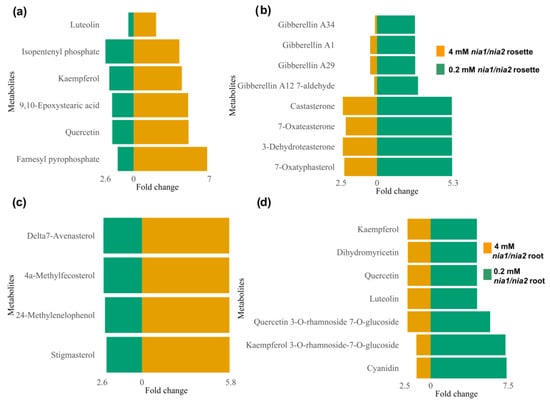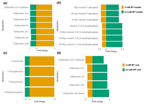 Comparative analysis of differentially synthesized/accumulated SMes mainly enriched in response to the N availability of the WT genotype (4 and 0.2 mM). Metabolites enriching the diterpenoid or brassinosteroids biosynthesis pathways with significant differences in their synthesis/accumulation in rosettes (shoots) at 4 mM and 0.2 mM (a,b) and in roots at the same concentrations ((c) and (d), respectively).
