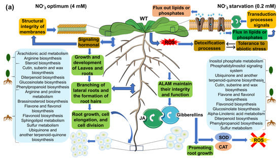 Regarding the metabolic pathways enriched in the roots of seedlings growing under the N-deprivation condition (0.2 mM), two routes were identified that attracted our attention. The first was the α-linolenic acid metabolism (ALAM) pathway, which is enriched by metabolites such as 13(S)-HPOT ((13S)-hydroxyoctadecadienoic acid) and (3Z)-Hex-3-en-1-yl acetate, which are essential components of membrane lipids in plants that, under stress conditions, undergo changes in their composition to maintain their integrity and function. In addition, ALAM and its derivatives, such as jasmonic acid (JA), act as signal molecules in the stress response through oxidative stress, interacting with other plant hormones, such as gibberellins, to regulate the stress response [,], consistent with the second pathway, diterpenoid biosynthesis, in which gibberellin A20, gibberellin A51, gibberellin A4, and gibberellin A44 diacid were found to be enriched under N starvation. These gibberellin-type metabolites are capable of modulating root growth and counteract the inhibitory effects of stress, promoting their growth under adverse conditions, as well as mitigating the oxidative stress produced by ROS and inducing the synthesis of enzymes such as superoxide dismutase (SOD) and catalase (CAT) [,]. The cutin, suberin, and wax biosynthesis pathways, as well as flavone and the flavonol biosynthesis, flavonoid biosynthesis, glucosinolate biosynthesis, phenylpropanoid biosynthesis, and sulfur metabolism pathways, were enriched by metabolites differentially synthesized/accumulated under either optimal or N-deprivation conditions. Many of them regulate the oxidative stress induced by ROS and are pathways whose SMes are involved in stress tolerance [,].