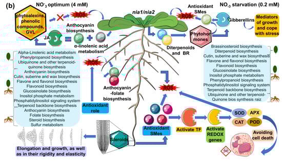 Regarding the metabolic pathways enriched in nia1/nia2 roots, we found that at 4 mM, anthocyanin biosynthesis is enriched by pelargonidin 3-O-glucoside and pelargonin; steroid biosynthesis is enriched by Δ7-avenasterol, 24-methylenelophenol, 4α-methyl fecosterol, and stigmasterol; the sulfur metabolism is enriched by sulfite; and folate biosynthesis is enriched by 7,8-dihydropteroic acid, dihydropteroate, and 2,5-diamino-6-(5’-phosphoribosyl amino)-4-pyrimidineone (Figure 10c). In contrast, at 0.2 mM, the phenylpropanoid biosynthesis pathway was enriched by syringin, coniferin, and sinapyl alcohol (Figure 10d). These metabolites may help to mitigate oxidative stress [,]. The remaining metabolic pathways were enriched by metabolites identified under optimal and N-deprivation conditions (4 and 0.2 mM, respectively) (Figure 10c,d). Anthocyanin biosynthesis pathways attracted our attention because these SMes play an antioxidant role and repair the damage caused by oxidative stress []. Steroids (another enriched metabolic pathway) are also known to play roles in the regulation of root elongation and growth, as well as in the rigidity and elasticity of roots, which directly affect their capacity for growth and expansion. Steroids also help to adapt to and protect roots from abiotic stress by maintaining membrane integrity and regulating ionic homeostasis in root cells [,]. Finally, folates (also known as B9 vitamins) are crucial intermediates for a set of reactions that involve the transfer of single-carbon units (C1 metabolism). They are directly involved in the synthesis of nucleic acids, methionine, pantothenate, glycine, and serine, as well as, indirectly through S-adenosyl methionine, in all methylation reactions. Electron donor–acceptor interactions of folates also contribute to the production of NADPH, which is used to detoxify ROS [,].