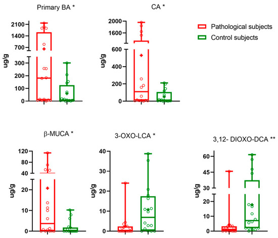 The median (line), mean (+), interquartile range and the minimum and maximum values of faecal BA are reported in the box and whiskers plots for pathological (red), and control subjects (green) in Figure 1. Primary BAs are significantly different (p-value 0.032).