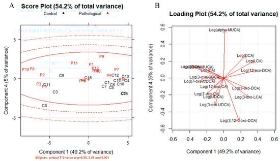 A correlation matrix was generated for all the samples, age, sex and dogs’ size, and we did not find any correlation (|rs|≥ 0.5) with BAs. Two correlation matrixes were generated to highlight the possible role of CDCA metabolites (Figure S3), one for controls and one for the pathological group. The results are reported in Table S3 in Supplementary Information. A positive correlation between β-MUCA and primary BAs was established for the pathological and control groups, while a negative correlation was found between β-MUCA and LCA. Principal component analysis (PCA) was performed to determine the presence of outliers and clusters using quantified BAs (logarithmically transformed). Firstly, we generated influence plots, one for each class (Figure S4 in Supplementary Information), using three and four components for the pathological group and controls, respectively, and any outlier was identified. Then, PCA was used to identify a multidimensional space cluster within the dataset. Figure 2 shows the score plot (a) and loading plot (b) (PC1 vs. PC4). Other PCs such as PC2 vs. PC4 were investigated (Figure S5).