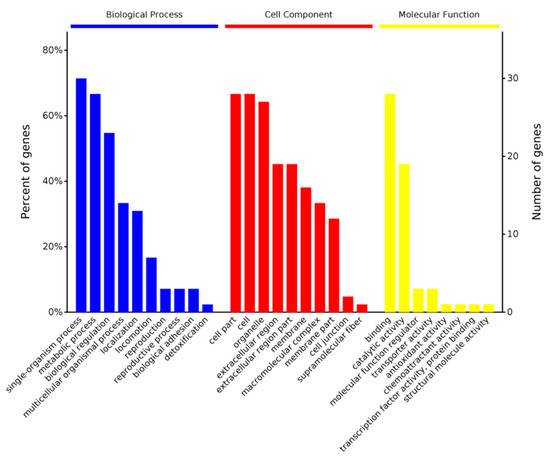 Differential protein GO (MF BP CC) functional annotation chart. The abscissa in the figure represents the enriched GO functional classification. The figure shows the top-ten level 2 entries in the enrichment analysis of three categories of BP, CC, and MF. The entries of each category are sorted from left to right according to their log value (p-value). The left side is more prominent. The vertical axis on the left represents the percentage of the number of proteins or genes corresponding to each entry to the total number of submitted proteins or genes. The vertical axis on the right represents the number of proteins or genes corresponding to each entry.