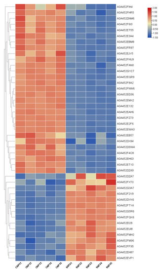 Results of cluster analysis of differentially expressed proteins. Each row represents a protein, and each column represents a group of samples. The logarithmic values of the expression amounts of significantly differentially expressed proteins in different samples are displayed in different colors in the heat map, with red representing a relatively high protein content and blue representing a relatively low protein content.