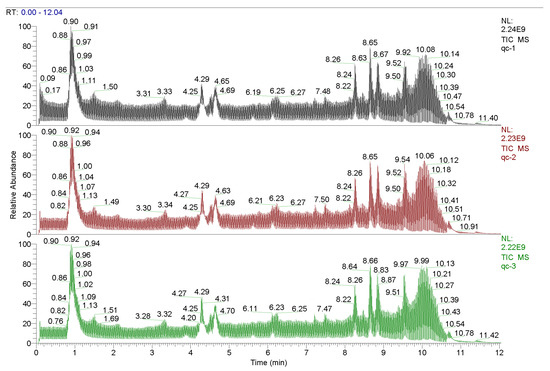 The mass spectrum conditions were as follows: the positive and negative ion patterns were detected using an electrospray ion source (ESI) and a Q-Exactive four-pole and electrostatic field orbital trap high-resolution mass spectrometer (Thermo Fisher Scientific). The spray voltage was set to ±3.5 kV, the mass spectrum collection range was 80~1200 m/z, the resolution was 17,500, and the ion source was HESI. The capillary voltage was 3500 V/3500 V (positive/negative ion mode), the capillary temperature was 300 °C, the internal temperature was 320 °C, the Sheath gas was 45 arb, the auxiliary gas was 10 arb, and the RF level of the S-Lens was 55.