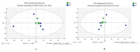 PCA scores of positive and negative ion modes. (A) the PCA score chart of the positive ion mode, and (B) the PCA score chart of the negative ion mode.