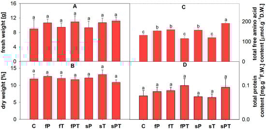 The fresh weight (A) and dry weight (B) of tomato fruit and the contents of total free proteinogenic amino acids (C) and soluble proteins (D). Penconazole (P), tebuconazole (T) or their combination (PT) were applied foliarly (fP, fT and fPT) or to the soil (sP, sT and sPT) and compared with the control treatment without triazoles (C). Different letters above each bar denote significant differences (p ≤ 0.05) between plant groups according to a one-way ANOVA (Holm–Sidak test). The same letters above a bar indicate that no significant differences were found between groups. Each column bar represents the mean ± SD. Experiments were prepared for five biological repeats. All measurements were performed at least three times. Abbreviations: D.W., dry weight.