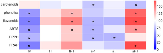 Total carotenoids, phenolics, flavonoids and antioxidant capacity measured using three different methods (ABTS, DPPH and FRAP) in tomato fruit. Penconazole (P), tebuconazole (T) or their combination (PT) were applied foliarly (fP, fT and fPT) or to the soil (sP, sT and sPT) and compared with a control without triazoles. Values are expressed as % of control (C). Asterisks denote significant differences (p ≤ 0.05) between the treated and control plants according to the one-way ANOVA (Holm–Sidak test). Experiments were prepared for five biological repeats. All measurements were performed at least three times.