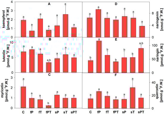 Identification and content of flavonoids in the peel of tomato fruits based on appropriate standards: kaempferol (A), luteolin (B), myricetin (C), naringenin (D), naringin (E), and quercetin (F). Penconazole (P), tebuconazole (T) or their combination (PT) were applied foliarly (fP, fT and fPT) or to the soil (sP, sT and sPT) and compared with the respective control without triazoles (C). Different letters above each bar denote significant differences (p ≤ 0.05) between plant groups according to a one-way analysis of variance (ANOVA; Holm–Sidak test). The same letters above a bar indicate that no significant differences were found between groups. Each column bar represents the mean ± SD. Experiments were prepared for five biological repeats. All measurements were performed at least three times. Abbreviations: F.W., fresh weight.