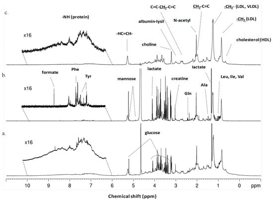 Typical 1H-NMR serum spectra of patients with ovarian neoplasms. (a) Typical 1H-NMR serum spectra (pulse sequence = noesygppr1d), (b) Typical CPMG 1H-NMR serum spectra showing only small molecules and (pulse sequence = cpmgpr1d) (c) Typical LED 1H-NMR serum spectra showing only large molecules (pulse sequence = ledbpgppr2s1d). Some of metabolites and functional groups detected are indicated.
