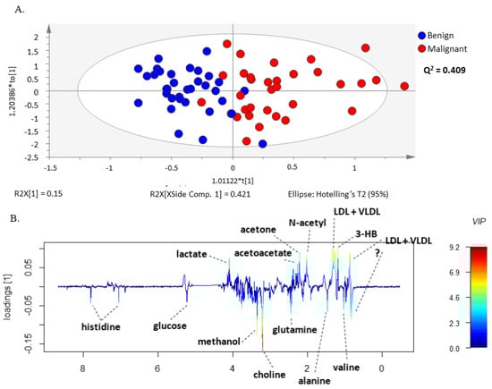 The validated OPLS-DA model enabled identification of the metabolite resonances responsible for the separation of serum samples from the two groups of patients through the analysis of the model weight loadings and VIP parameter. Only the signals corresponding to VIP values > 1 were considered as having a significant impact on group separation. This criterion was fulfilled for histidine, glucose, methanol, choline, glutamine, alanine, valine, lactate, acetoacetate, acetone, LDL + VLDL, 3-hydrobutyrate, N-acetyl functional group and lipids functional groups (Figure 2 and Figure 3). Interestingly, the corresponding loading weights revealed that several metabolites were differently increased in serum from patients with malignant tumors compared to benign neoplasms. Therefore, an increase in histidine, glucose, methanol, choline, glutamine, alanine and valine was found in serum from patients with benign neoplasms, whereas patients with malignant tumors presented increased serum values in lactate, acetoacetate, acetone, LDL + VLDL, 3-hydrobutyrate as well as N-acetyl functional group and lipids functional groups (Figure 2B and Figure 3B).
