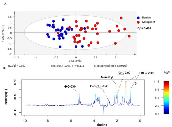To evaluate the differences between benign and malignant neoplasms, serum 1H-NMR spectra obtained with CPMG and LED pulse programs were analyzed through PCA. This analysis was able to separate serum samples from patients with benign neoplasms from patients with malignant neoplasms, therefore reflecting significant differences in terms of blood serum composition between groups (Figure S1).