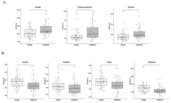 The differences in metabolites between groups were further assessed by comparing the corresponding spectral areas using non-parametric univariate tests adjusted for multiple testing. Therefore, lactate, 3-hydroxybutyrate, acetone, acetate, histidine, valine and methanol were significantly altered between groups, in which lactate, 3-hydroxybutyrate and acetone were significantly increased in serum samples from patients with malignant tumors (Figure 4A), whereas acetate, histidine, valine and methanol were decreased in serum samples from patients with malignant tumors (Figure 4B). Given the impossibility of correctly assessing the spectral areas, this analysis was not performed for some of the metabolites such as choline.