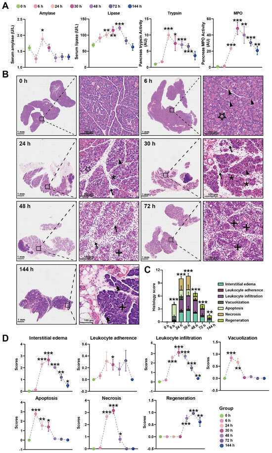 Time-course biochemical indexes and pathological changes of SAP induced by L-ornithine (2.8 g/kg × 2, 28%) (A) Multiple indicators of pancreatitis including serum amylase, serum lipase, pancreatic MPO, and pancreatic trypsin were assessed at 0, 6, 24, 30, 48, 72, and 144 h after the final injection of Orn. (B) Representative images of pancreatic histopathologic changes in response to intraperitoneal administration of Orn. Triangles for apoptotic bodies, pentagram for vacuolization, asterisks for necrosis, arrows for neutrophils, plus sign for ductuloacinar structures, and double triangle for the completed regeneration of acinar cells. Total histologic scores (C) and each histologic scoring (D) for pancreatic tissue samples in interstitial edema, leukocyte adherence and infiltration, vacuolization, apoptosis, necrosis, and regeneration at the different time points. * p < 0.05, ** p < 0.01, and *** p < 0.001 vs. 0 h; n = 6–8. Data are presented as mean value ± SEM.