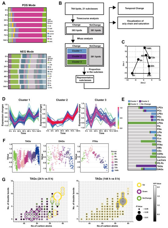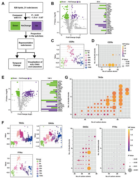 Similarly, Figure 3E shows the results of the comparison between 144 h and 0 h, with the lipid species depicted as a proportion of their subclasses. TAGs were significantly up-regulated at 144 h, which was not observed in the previous time-course analysis (Figure 3E). TAGs reached their peak level at 24–30 h before DAGs but did not return to the baseline level at 144 h. FFAs, which are the hydrolysis products of TAGs and DAGs, exhibited a similar pattern, peaking at 24 h followed by a rapid decline (Figure 3F). To visualize the acyl chain characteristics of TAGs, DAGs, and FFAs at 144 h, the carbon atoms and double bond counts were analyzed. It was found that TAGs with more than 56 carbon atoms differed more from other TAGs, and the difference became more pronounced with an increased number of double bonds. (Figure 3G). Collectively, CERs only perturbed significantly at inflammatory peak time around 24–30 h, while both TAGs and FFAs increased at 24 h, and TAGs with long-chain unsaturated fatty acyls still maintained a high level at 144 h in comparison to 0 h.