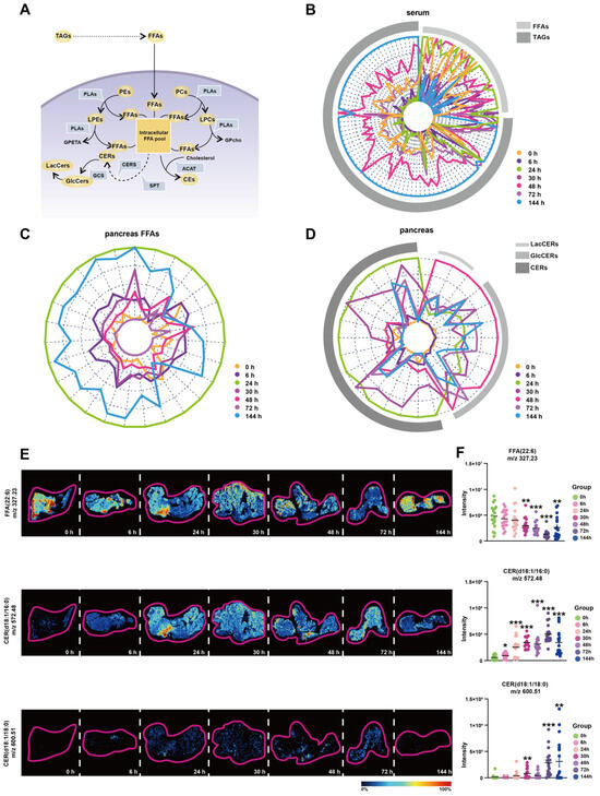 To enhance our understanding of the transformation relationships among these lipids at various time points, we have depicted their lipid content levels using radial plots, depicting changes of TAGs and FFAs in serum; changes of FFAs in pancreas; and changes of CERs, GlcCers, and LacCers in pancreas, respectively. In these plots, each line corresponds to a specific lipid, while arcs in various shades of grey represent different lipid subclasses. We have employed distinct colors to differentiate between the different time points, allowing for easier interpretation of the transformation patterns. Figure 5B shows the changes of TAGs and FFAs in the serum. The green curve, representing 24 h, exhibits an expansion of the FFAs arcs, indicating an increase in FFAs. Conversely, the blue curve, representing 144 h, demonstrates an expansion of the TAGs arcs, suggesting an increase in TAGs. These findings reveal distinct shifts trends in the levels of FFAs and TAGs over time in the serum. Figure 5C shows the changes of FFAs in the pancreas, The outermost circle, represented by green, corresponds to 24 h, and as the time progresses, the circle gradually shrinks, indicating a decrease in FFAs. However, the circle corresponding to 144 h, denoted by blue, expands, suggesting an accumulation of FFAs at this time point in the pancreas. Figure 5D shows the changes of CERs, GlcCers and LacCers in the pancreas. The curve associated with 24 h, represented by green, expands under the CERs arcs, indicating an increase in CERs. Conversely, the curve representing 48 h, indicated by red, exhibits a reduction in the CERs arcs while expanding under the LacCers and GlcCers arcs. These complementary curves form a cohesive circle, suggesting an intrinsic link in the transformation of lipids between CERs, LacCers, and GlcCers. The mRNA expression of relative metabolic enzymes, including SPTC1, SPTC2, CERS2, CERS4, ACAT2, and GCS, were determined in pancreas, which supported the possible synthesis of CEs, and inter-conversion among CERs (Figure S3).