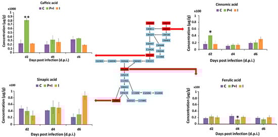 - Liu, S.; Jiang, J.; Ma, Z.; Xiao, M.; Yang, L.; Tian, B.; Yu, Y.; Bi, C.; Fang, A.; Yang, Y. The Role of Hydroxycinnamic Acid Amide Pathway in Plant Immunity. Front. Plant Sci. 2022, 13, 922119. [Google Scholar] [CrossRef] [PubMed]
