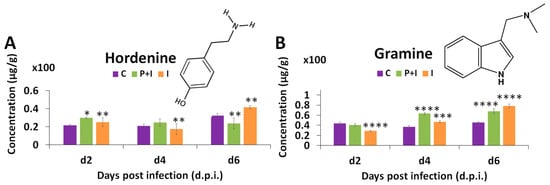 - Hamany Djande, C.Y.; Steenkamp, P.A.; Piater, L.A.; Tugizimana, F.; Dubery, I.A. Hordatines and associated precursors dominate metabolite profiles of barley (Hordeum vulgare L.) seedlings: A metabolomics study of five cultivars. Metabolites 2022, 12, 310. [Google Scholar] [CrossRef]