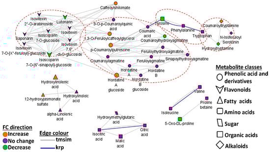 - Barupal, D.K.; Haldiya, P.K.; Wohlgemuth, G.; Kind, T.; Kothari, S.L.; Pinkerton, K.E.; Fiehn, O. MetaMapp: Mapping and visualizing metabolomic data by integrating information from biochemical pathways and chemical and mass spectral similarity. BMC Bioinform. 2012, 13, 1–15. [Google Scholar] [CrossRef]
