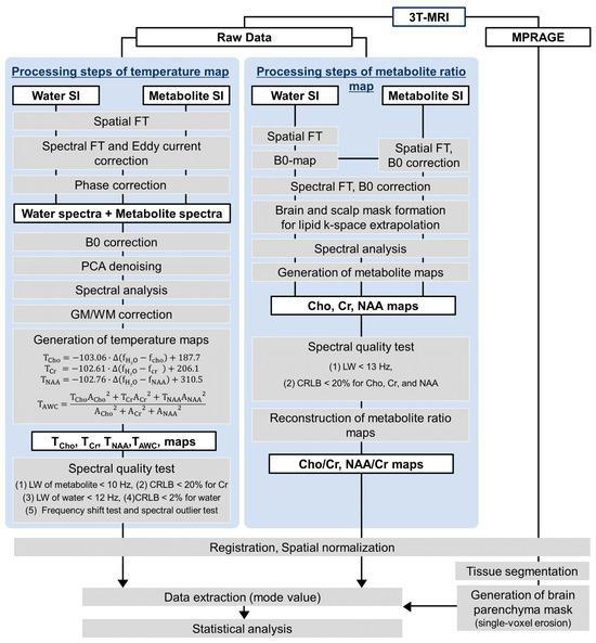 Since brain temperature by WB-MRSI is estimated from the frequency and amplitude of the brain’s major metabolites, this study also reconstructed the maps of major metabolite concentrations. The calculation of these concentrations (i.e., NAA, Cho, and Cr) followed the processing steps and parameters for the normal database. The steps included data resampling, spatial reconstruction, B0 correction, spatial registration, brain and scalp mask formation for lipid k-space extrapolation, spectral fitting, and signal normalization. For all metabolites, only those voxels with (1) linewidth (LW) less than 13 Hz and (2) Cramer–Rao lower bound (CRLB) less than 20% were extracted. From these metabolite concentrations, two brain metabolite ratio maps commonly used metrics in clinics, i.e., NAA/Cr and Cho/Cr, were reconstructed using ImageJ software version 1.51 (National Institutes of Health, Bethesda, MD, USA) [31].