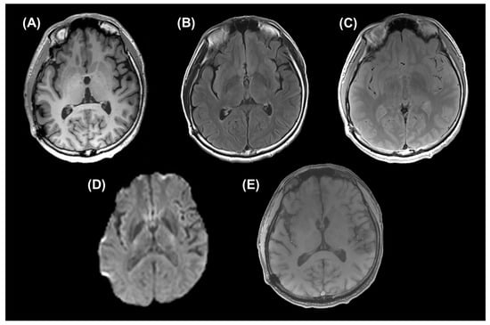 Figure 2. Conventional MRI sequences of a patient {48-year-old male with mild traumatic brain injury (TBI) in chronic phase}. (A) An axial reconstructed image of magnetization-prepared rapid acquisition gradient-echo (MPRAGE) sequence (repetition time (TR)/ echo time (TE)/ inversion time (TI) = 1900/2.85/900 ms), (B) an axial fluid-attenuated inversion recovery (FLAIR) image (TR/TE/TI = 12,000/115/2800 ms), (C) an axial proton density-weighted image (PDWI) (TR/TE = 4000/12 ms), (D) trace of an axial diffusion imaging sequence (TR/TE = 4000/83.2 ms, maximum b-value = 8000 s/mm2), and (E) an axial 3D gradient-echo susceptibility-weighted image (SWI) (TR/TE = 24/3.9 ms, flip angle (FA) = 73°) are given.