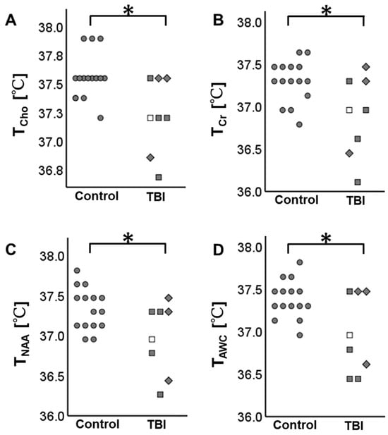 The brain temperature measurable by any method (i.e., TCho, TCr, TNAA, or TAWC) was significantly lower in the TBI patients than in the control group (FDR-corrected p < 0.05). Figure 3 summarizes the results.