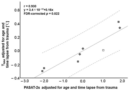 Figure 4. Scatterplots showing the relationship between the brain temperature derived from N-acetyl aspartate (TNAA) and 2 s paced auditory serial addition test (PASAT-2s) (r = 0.930, FDR-corrected p = 0.022). The solid line represents the mean and the dotted lines are the 95% confidence interval. □ Mild TBI in subacute phase, ■ mild TBI in chronic phase, and ◆ moderate TBI in chronic phase.