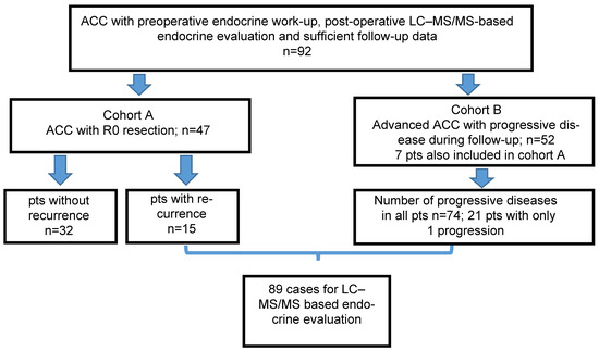 The total cohort consisted of 92 patients. Cohort A had 47 patients with R0 resection, of whom 15 patients developed recurrence during follow-up and 32 patients remained without recurrence. Cohort B contained 52 patients with advanced ACC and progressive disease (including 7 patients of cohort A with recurrence). For patients with progressive disease occurring more than once, each of these dates was investigated separately, resulting in a number of 74 cases with progressive disease, leading to total 89 cases with recurrence or progress documented by imaging (Figure 1). Patients’ characteristics are given in Table 1. All patients had a histological confirmed ACC and had a preoperative hormone evaluation. Most of them presented with a glucocorticoid and androgen excess at first diagnosis. All patients had routine imaging with CT, MRI, and/or FDG/PET–CT every two to four months. Steroid hormones were measured at every time point of imaging and in some patients in between by LC–MS/MS.