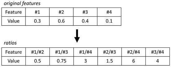 The concept of log ratios explained. To eliminate size effects (or dilution effects), internal ratios can be considered to omit the need for normalization. Here, the internal ratios of the original features are calculated.