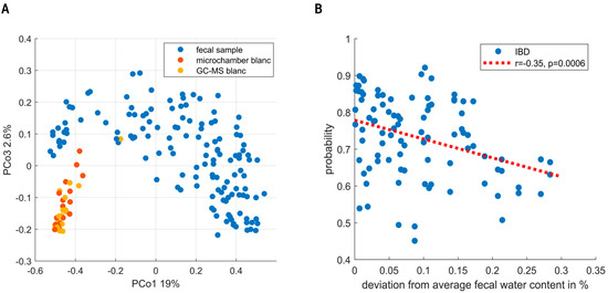 (A) Principal Coordinate Score plot resulting from unsupervised random forest. Fecal headspace samples (blue) are clearly separated from microchamber blanks (red) and instrumental blanks (i.e., GC-MS, yellow). Moreover, clear overlap is seen between microchamber and instrumental blanks. Altogether, these results show that indeed the subsequent data analyses were based on VOCs truly coming from fecal headspace with reasonable certainty. (B) The predictions of the IBD population are classified as IBD. On the x-axis, the deviation from average fecal water content (74%) is shown. As observed, either dry (i.e., more constipated) or wet (i.e., diarrhea) samples lowered the certainty of predictions.