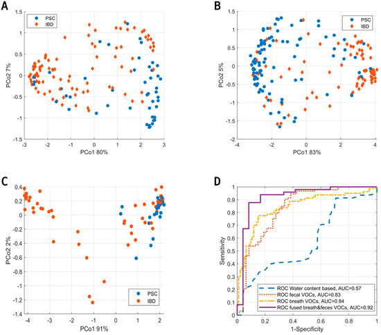 Upon the assessment of fecal VOCs, the data were fused with VOCs from exhaled breath analysis using proximity stacking. The fused model resulted in a sensitivity, specificity and AUC of 88%, 92% and 0.92, respectively. PCoA score plots of all models (i.e., based on fecal headspace, exhaled breath and the fused model) are shown in Figure 5A–C below with their corresponding ROC curves (Figure 5D).