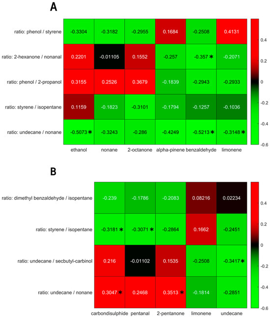 (A) Univariate correlations between exhaled breath volatiles (x-axis) and fecal headspace (y-axis) for the PSC population. (B) Univariate correlations between exhaled breath volatiles (x-axis) and fecal headspace (y-axis) for the IBD population. Significant correlations (p < 0.05) are marked using *. Note: upon Benjamin Hochberg correction, no correlation retained significance.