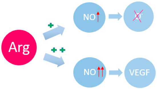 Arg and its participation in redox regulation. NO—nitric oxide; VEGF—vascular endothelial growth factor. The plus sign indicates the induction force; the arrow indicates the magnification force.